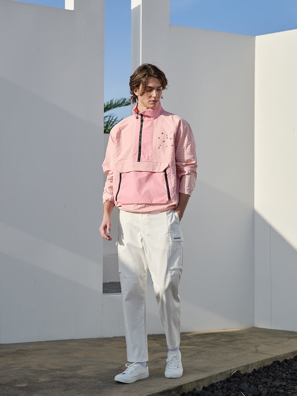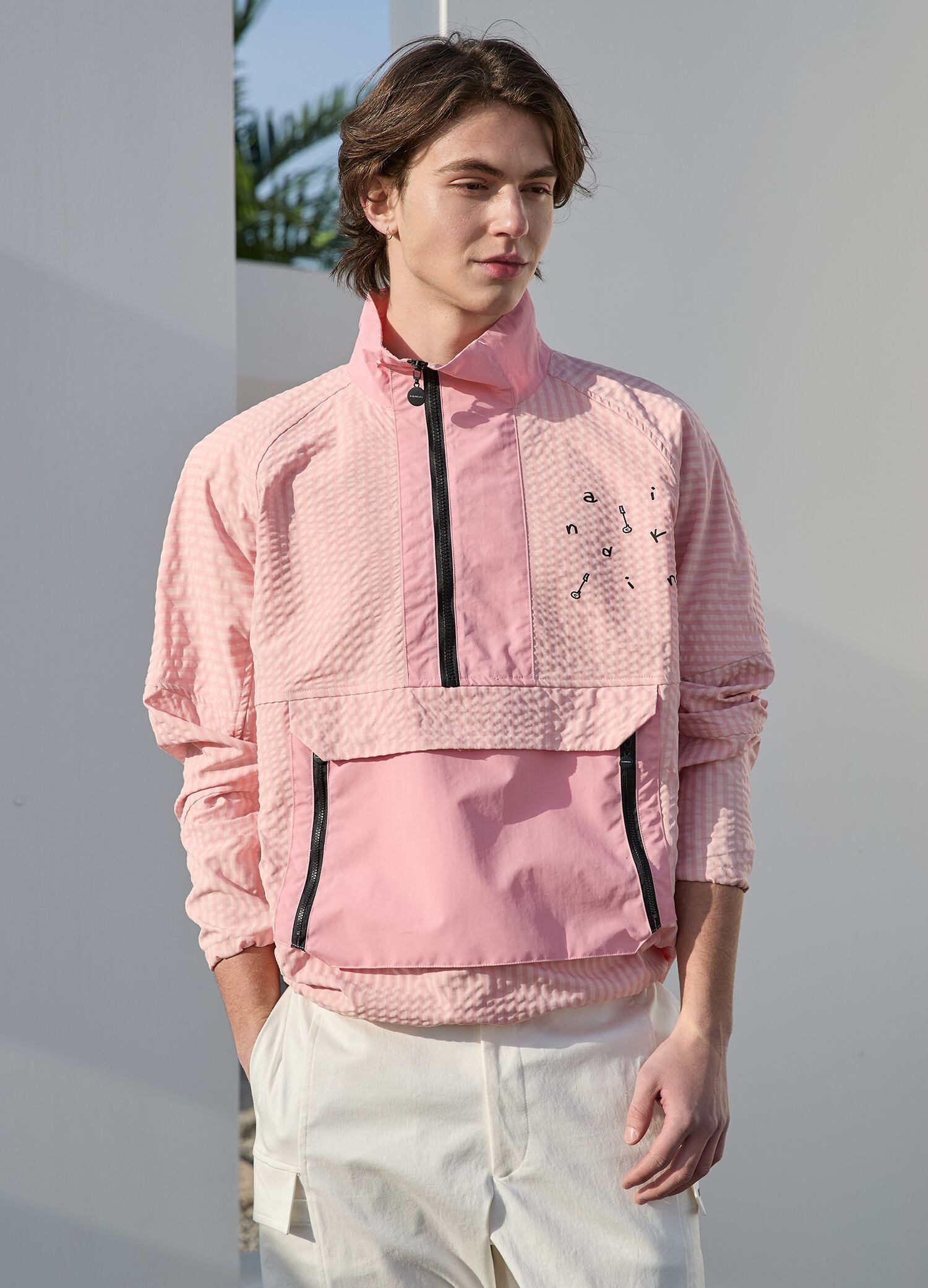 男女兼用で着用できる、ゆったりとしたボックスシルエットのハーフジップウィンドブレーカーです。