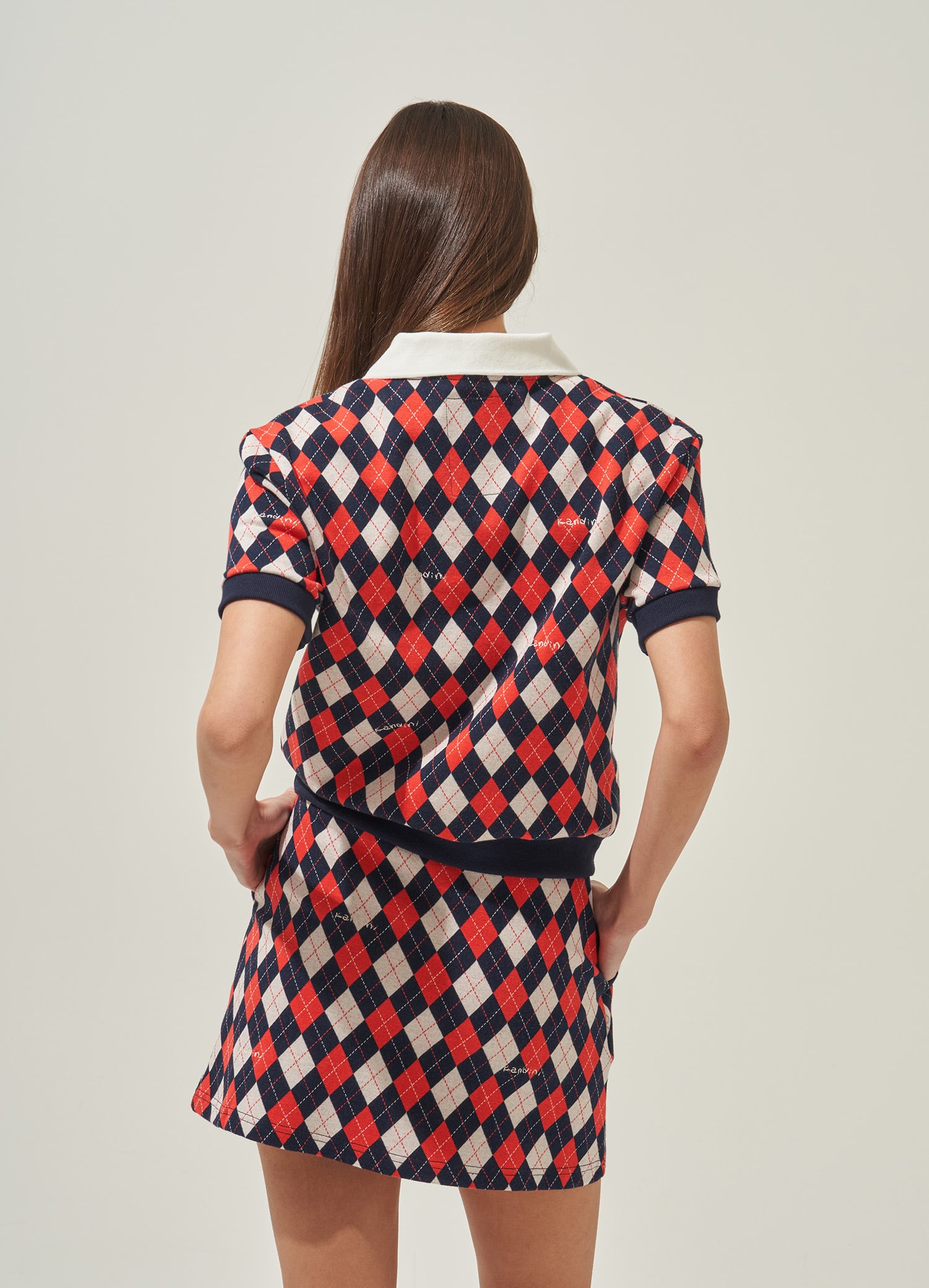 トラッドなアーガイルパターンにブランドロゴの刺繍を施し、クラシカルで高級感のあるムードに仕上げた一着です。