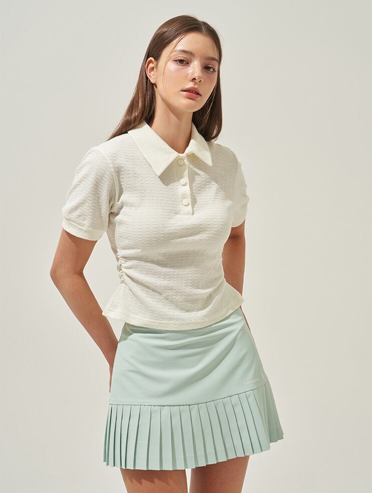 サイドにあしらったシャーリングディテールがボディラインを美しく引き立て、女性らしいシルエットを演出します。